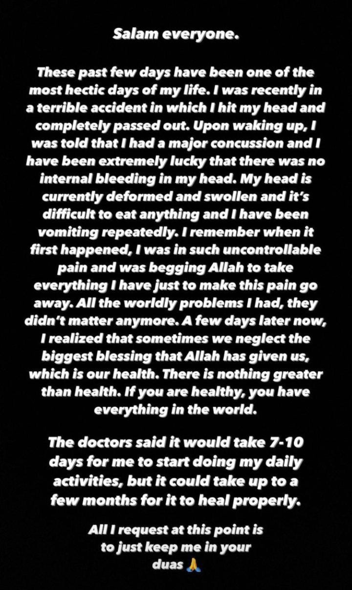 "حال ہی میں میرا بدترین ایکسیڈنٹ ہوا ہے جس کے بعد جب میں ہوش میں آیا تو میرا سر بگڑ چکا ہے۔ بہت زیادہ سوجن ہے۔ میں کچھ کھا بھی نہیں پارہا اور بار بار الٹیاں ہورہی ہیں"
