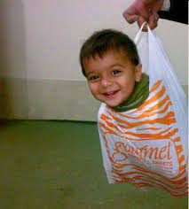 کسی نے اس بچے کو تھیلے کے اندر ڈال دیا اور بچہ کافی خوش بھی دکھائی دے رہا ہے۔