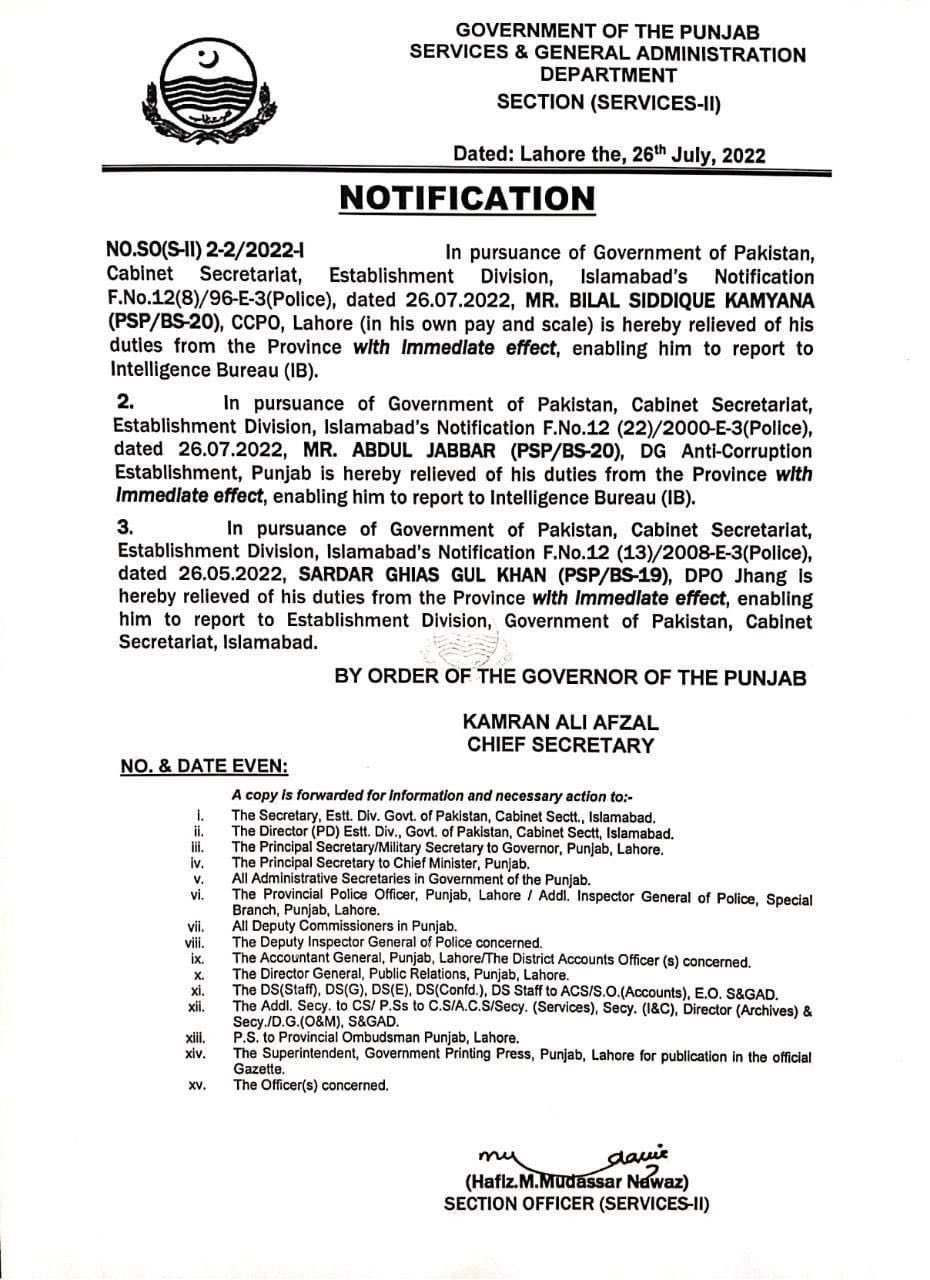 ڈی پی او جھنگ سردار غیاث گل کو بھی پنجاب سے فارغ کردیا گیا ہے جبکہ ایڈووکیٹ جنرل پنجاب شہزاد شوکت مستعفی ہوگئے ہیں، شہزاد شوکت نے اپنا استعفیٰ گورنر پنجاب کو بھجوا دیا۔