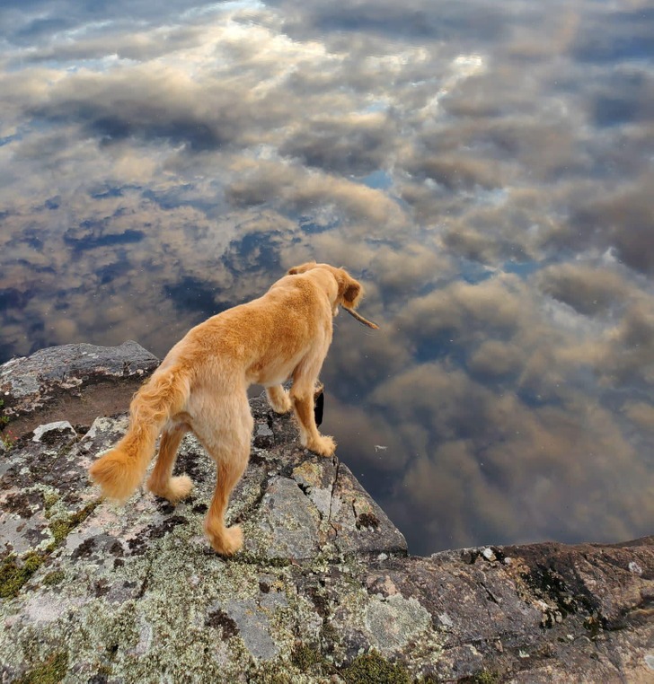 اس تصویر میں ایسا لگ رہا ہے جیسے یہ کتا آسمان سے بھی اوپر پہنچ چکا ہے اور سر نیچے کر کے آسمان کو دیکھ رہا ہے۔ در حقیقت پہاڑ کے کنارے کھڑے ہوکر نیچے دیکھا جارہا ہے۔ پہاڑ اتنا اونچا ہے کہ تیرتے ہوئے بادل پیروں تلے آسمان کا نظارہ پیش کررہے ہیں۔
