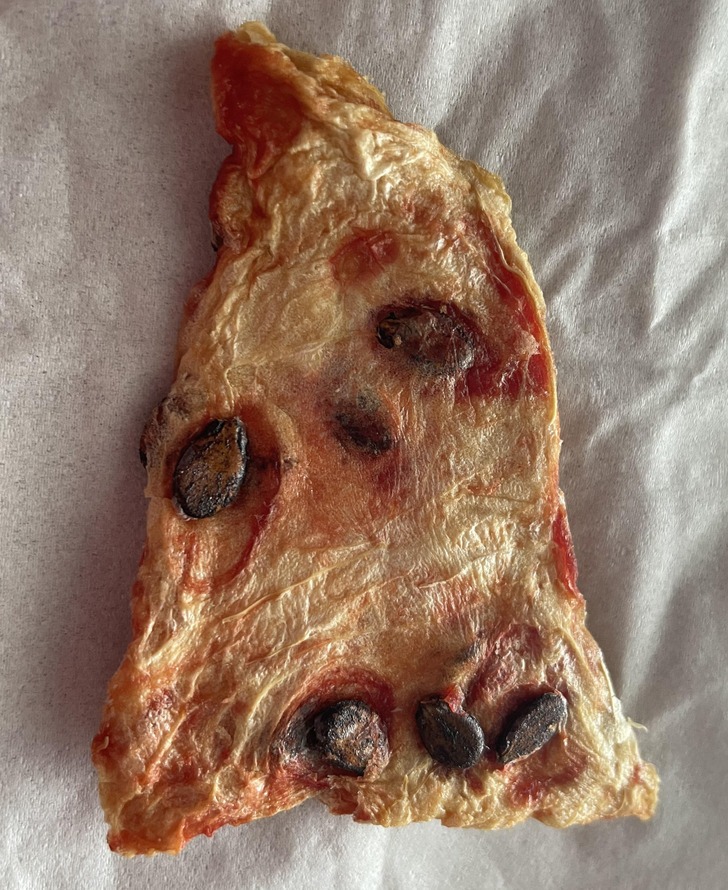 تصویر میں سوکھا ہوا پیزا لگنے والی یہ چیز پیزا نہیں بلکہ تربوز کا سوکھا ہوا ٹکڑا ہے۔
