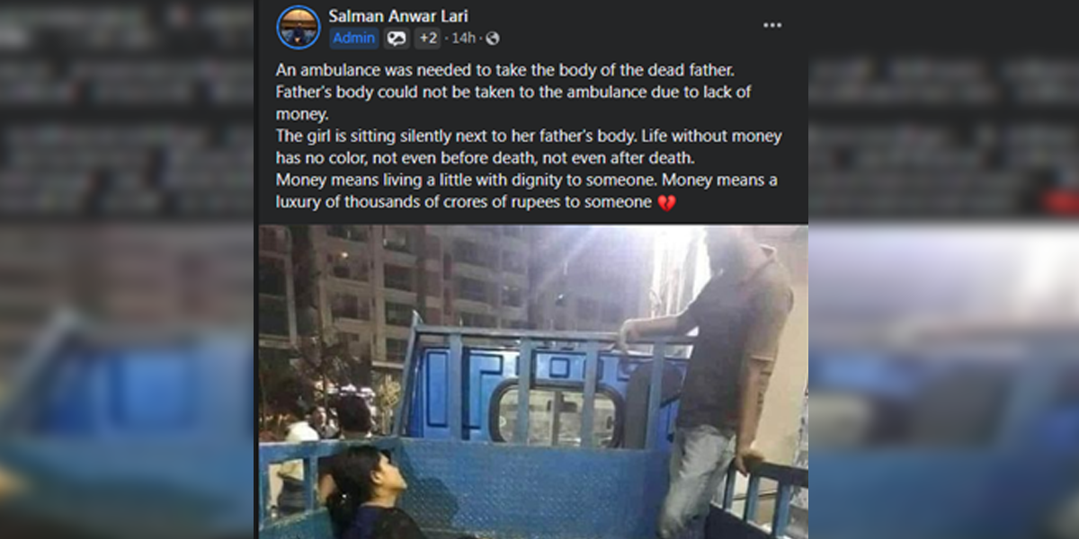 یہ دردناک تصویر سوشل میڈیا پر وائرل ہو رہی ہے جو ایک صارف کے شئیر کی ہے۔ صارف نے اس تصویر کے کیپشن میں لکھا کہ جاں بحق والد کی لاش لے جانے کے لیے ایمبولینس کی ضرورت تھی۔ پیسے نہ ہونے کی وجہ سے والد کی میت ایمبولینس تک نہ پہنچائی جا سکی۔