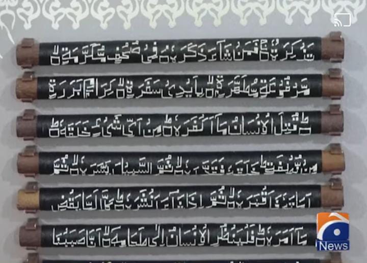 ہر مسلمان قرآن مجید سے کچھ ایسی عقیدت رکھتا ہے جسے الفاظ میں بیان کرنا ممکن نہیں۔ شاید یہی وجہ ہے کہ کچھ لوگ اپنے جذبات کو خوبصورت آرٹ کی صورت میں ظاہر کرتے ہیں۔ ان ہی میں سے ایک ہیں 70 سالہ سابق پولیس اہلکار خان شاہ نواز جنھوں نے پینسل پر دھاگوں کی صورت مکمل قرآن مجید بُننے کی سعادت حاصل کی ہے۔