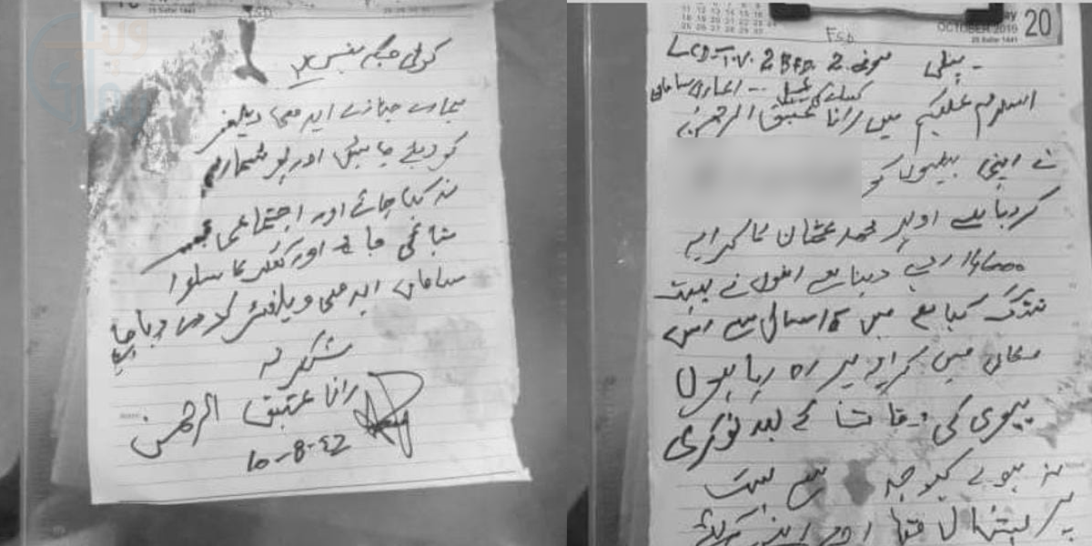 خط میں عتیق نے لکھا کہ میرا نام رانا عتیق الرحمان ہے، میں نے اپنی بیٹیوں کی زندگی ختم کر دی ہے، میرے مالک مکان محمد عثمان کا کرایہ 146000 ہے، میرے مالک مکان نےمجھے بہت تنگ کیا ہے۔ میں یہاں 15 سال سے رہ رہا ہوں۔ میری اہلیہ کی وفات کے بعد میں کوئی کام نہیں کر رہا تھا، اسی لیے بہت پریشان ہوں۔ ہمارے پاس رہنے کو کئی جگہ نہیں۔