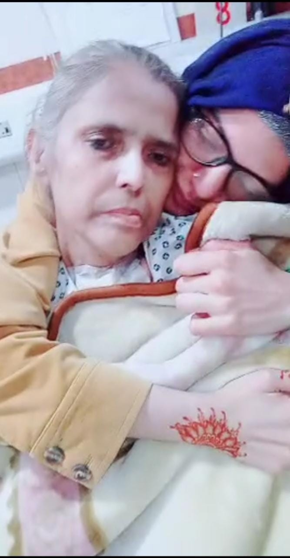 تصاویر میں دیکھا جاسکتا ہے کہ بوڑھی خاتون کس طرح نقاہت کے مارے ایک جانب گردن ڈھلکائے ہوئے ہیں جبکہ ان کی بیٹی انھیں پیار سے گلے لگا رہی ہے۔ اپنی دکھ بھری کہانی بیان کرتے حنا نے سوشل میڈیا پر لوگوں سے مالی امداد کی گزارش کی ہے۔ مخیر افراد گروپ کے ذریعے ان سے رابطہ کرسکتے ہیں۔