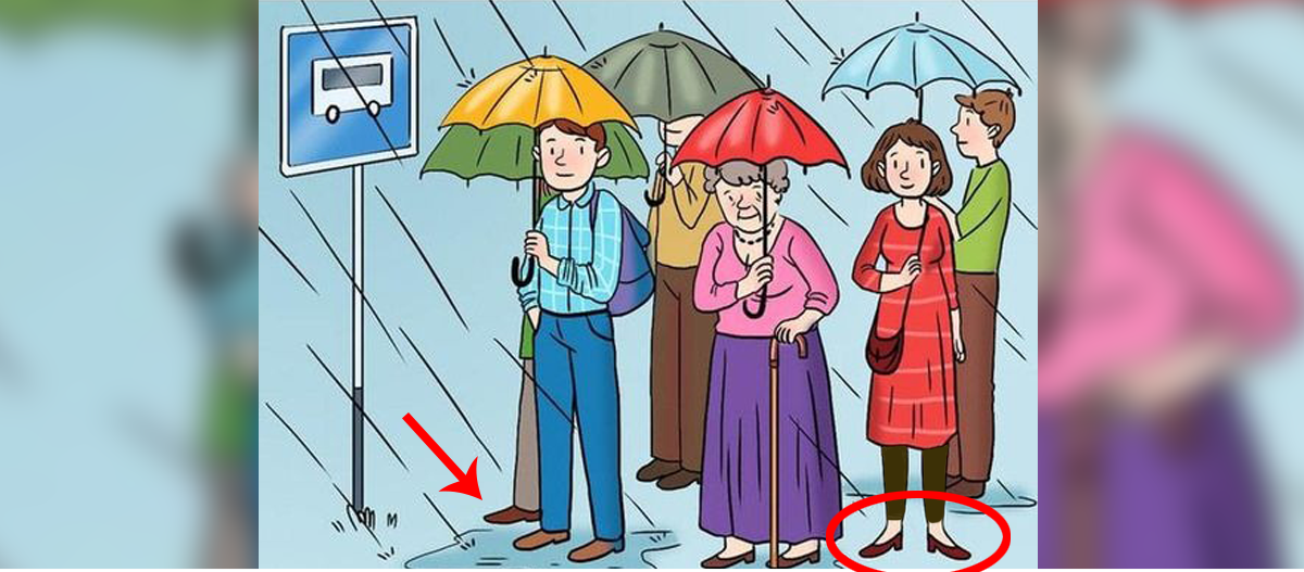 ایک خاتون کے پاس چھتری نہیں ہے جسے دیکھ کر ممکن ہے کہ آپ درست جواب دینے کے قریب قریب ہوں۔ غور سے اس پینٹنگ تصویر کو دیکھیں اور بتائیں کہ غلطی کیا ہے۔