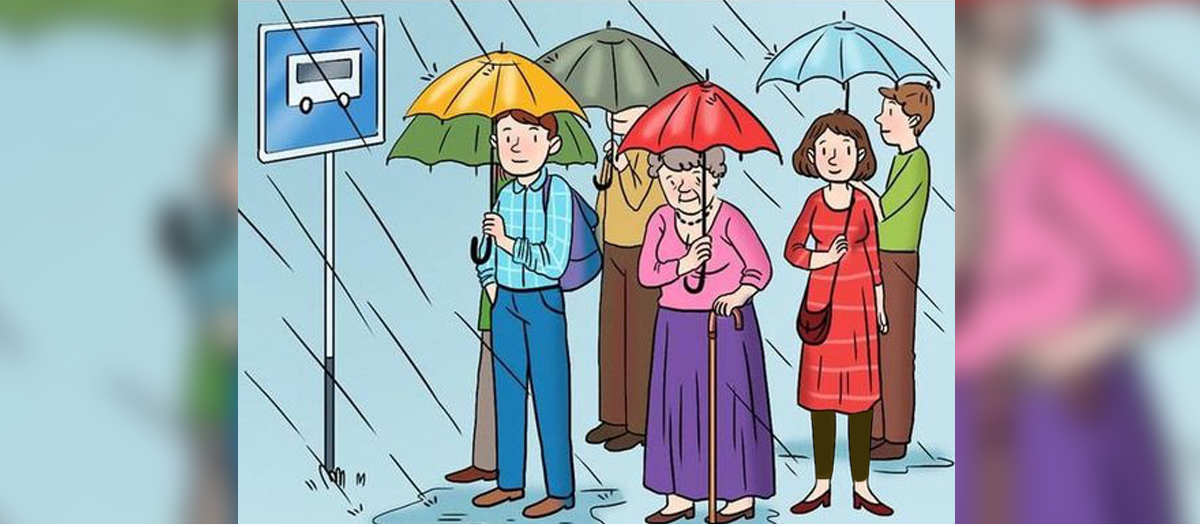 تصویر میں چند لوگ بس اسٹاپ پر موجود ہیں جو بس کا انتظار کر رہے ہیں جبکہ بارش بھی ہورہی ہے اور انہی میں کچھ لوگ ہاتھوں میں چھتری تھامے ہوئے ہیں۔