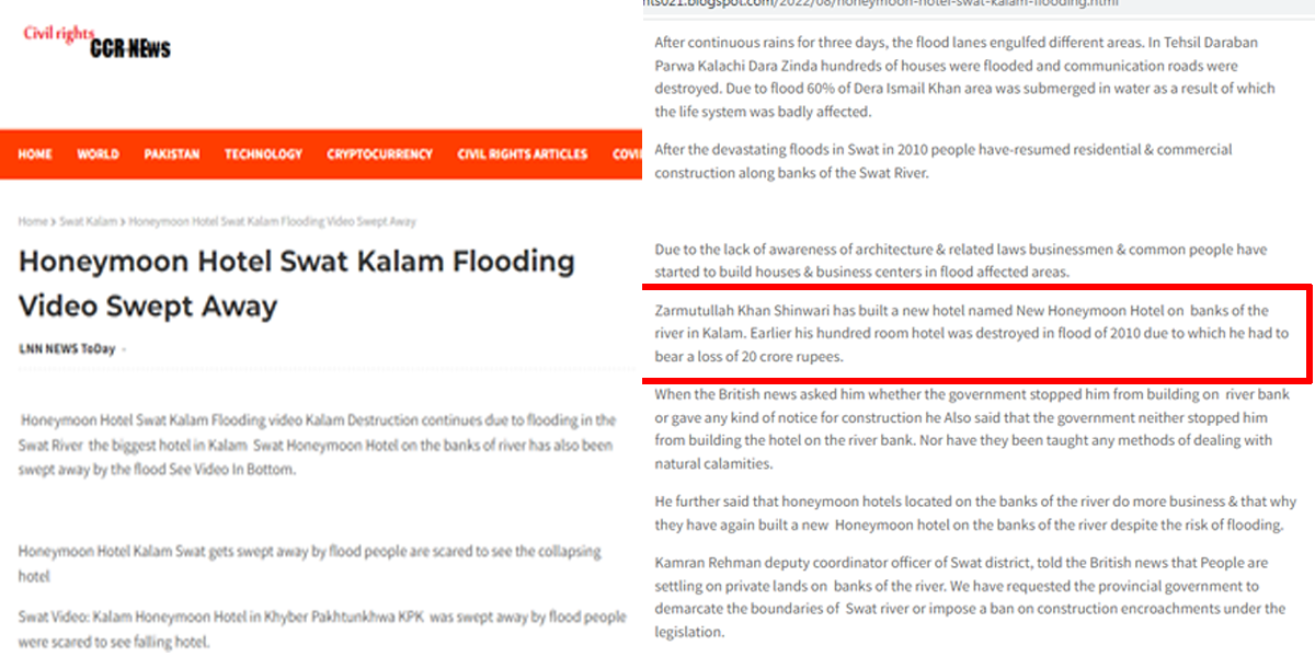 ان کا مزید کہنا تھا کہ دریا کے کنارے واقع ہنی مون ہوٹل زیادہ کاروبار کرتے ہیں اور اسی لیے انہوں نے سیلاب کے خطرے کے باوجود دوبارہ دریا کے کنارے پر نیا ہنی مون ہوٹل بنایا ہے۔