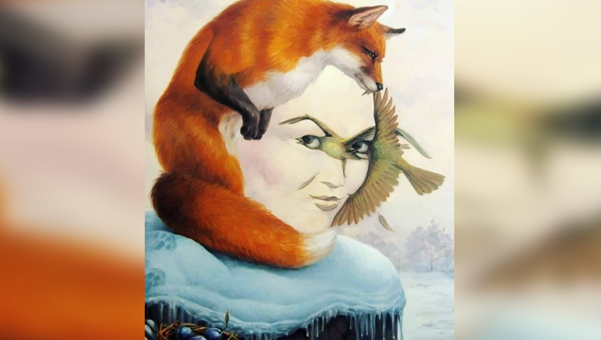 دراصل اس تصویر میں کوئی عورت موجود نہیں بلکہ لومڑی اور پرندے کے اس انداز سے تخلیق کیا گیا ہے جس سے عورت کی تصویر ظاہر ہو رہی ہے۔