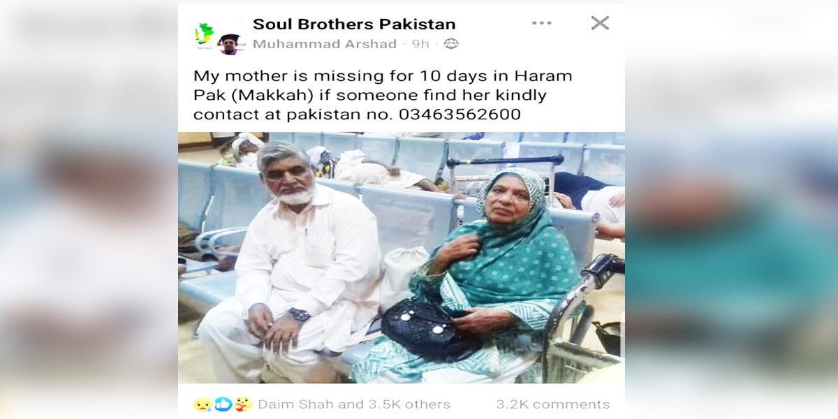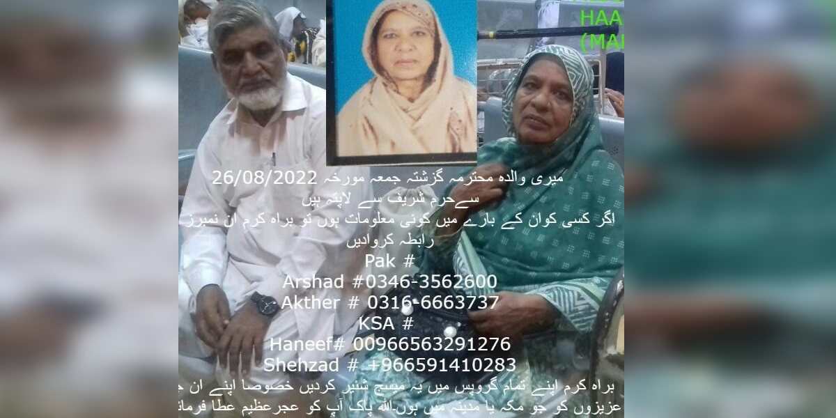 محمد ارشد کا کہنا تھا کہ میری والدہ گزشتہ 10 دنوں سے حرم پاک میں لاپتہ ہیں، اگر کسی کو معلومات ملیں یا ان کی کوئی خبر ملے تو ہمیں پاکستان کے اس نمبر 03463562600 پر رابطہ کر سکتے ہیں۔