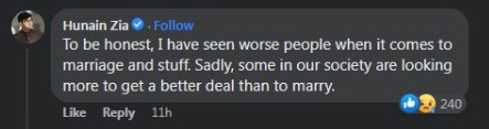 حنین نامی صارف نے تبصرہ کیا کہ سچ پوچھیں تو میں نے اس سے بھی بدتر لوگ دیکھے ہیں جب بات شادی یا کسی چیزوں کی ہو ۔ افسوس کی بات یہ ہے کہ ہمارے معاشرے میں کچھ لوگ شادی کرنے سے بہتر ڈیل حاصل کرنے کی کوشش کرتے ہیں۔