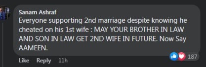 صنم اشرف نامی صارف اس معمالے پر لکھتی ہیں کہ ہر کوئی دوسری شادی کی حمایت کر رہا ہے یہ سچ جاننے کے باوجود کہ اس نے اپنی پہلی بیوی کو دھوکہ دیا ہے۔ مستقبل میں آپ کے بہنوئی یا داماد کو دوسری بیوی ملے۔ اب آمین کہیں۔