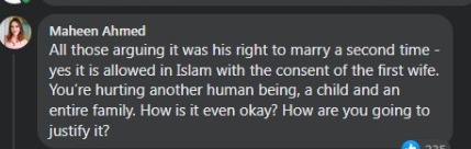 ماہین احمد نامی صارف نے اس پوسٹ پر لکھا کہ وہ تمام لوگ جو بحث کر رہے ہیں دوسری شادی کرنے اس کا حق ہے۔ ہاں اسلام میں پہلی بیوی کی رضامندی سے اس بات کی اجازت لینا ضروری ہے۔ آپ دوسرے انسان، ایک بچے اور پورے خاندان کو تکلیف دے رہے ہیں۔ یہ کیسے ٹھیک ہے؟ آپ اس کا جواز کیسے پیش کریں گے؟