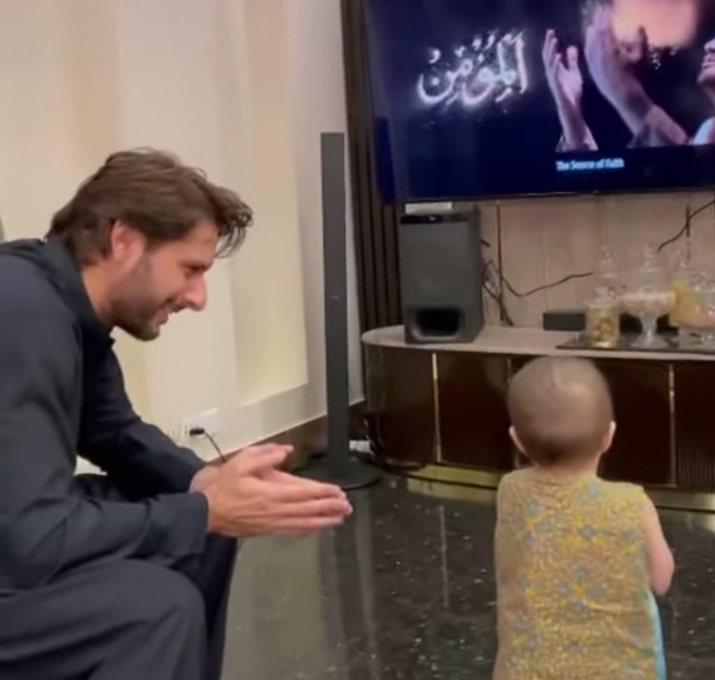 اس تصویر میں دیکھا جا سکتا ہے کہ شاہد آفریدی نے بیٹی کو اللہ کے نام سکھانے کے لیے ٹی وی کی طرف متوجہ کیا ہے، جس میں بیٹی کی خوب توجہ دے رہی ہے۔ شاہد آفریدی گھر میں بیٹیوں کی تربیت پر تو توجہ دیتے ہی ہیں ساتھ ہی انہیں باپ کے ساتھ ساتھ دوست ہونے کا بھی احساس دلاتے ہیں، تاکہ وہ اپنے والد کی ہر بات کو سمجھیں۔