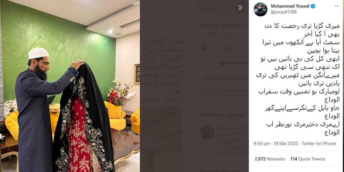 حال ہی میں محمد یوسف کی بڑی بیٹی کی شادی ہوئی ہے، اپنی بیٹی کی شادی کی خوشخبری کرکٹر نے مداحوں سے ٹوئیٹر پر شئیر کی تھی، محمد یوسف کا کہنا تھا کہ میری گڑیا تری رخصت کا دن بھی آ گیا آخر سمٹ آیا ہے آنکھوں میں تیرا بیتا ہوا بچپن ابھی کل کی ہی باتیں ہیں تو اک ننھی سی گڑیا تھی میرے آنگن میں ٹھہریں کی تری یادیں تری باتیں لو مبارک ہو تمہیں وقت سفر اب الوداع جاو بابل کے نگر سے اپنے گھر الوداع اے مری دختر مری نور نظر اب الوداع۔