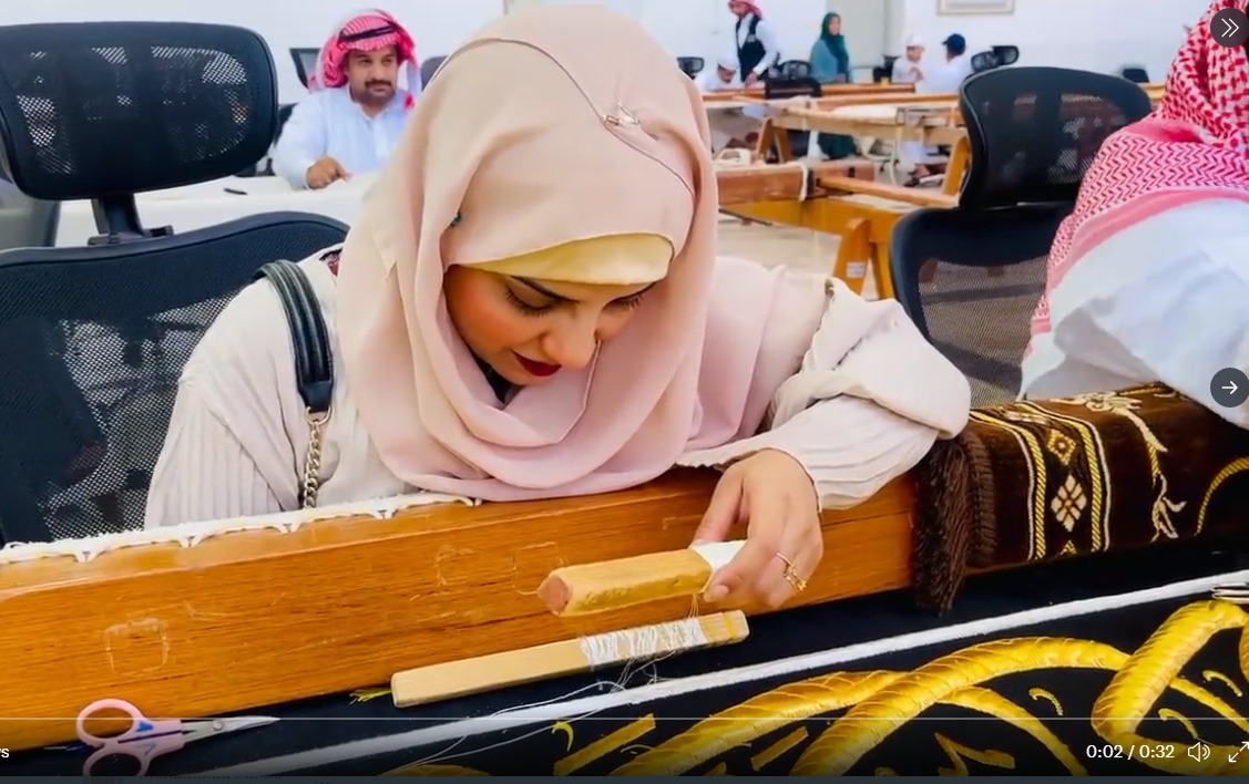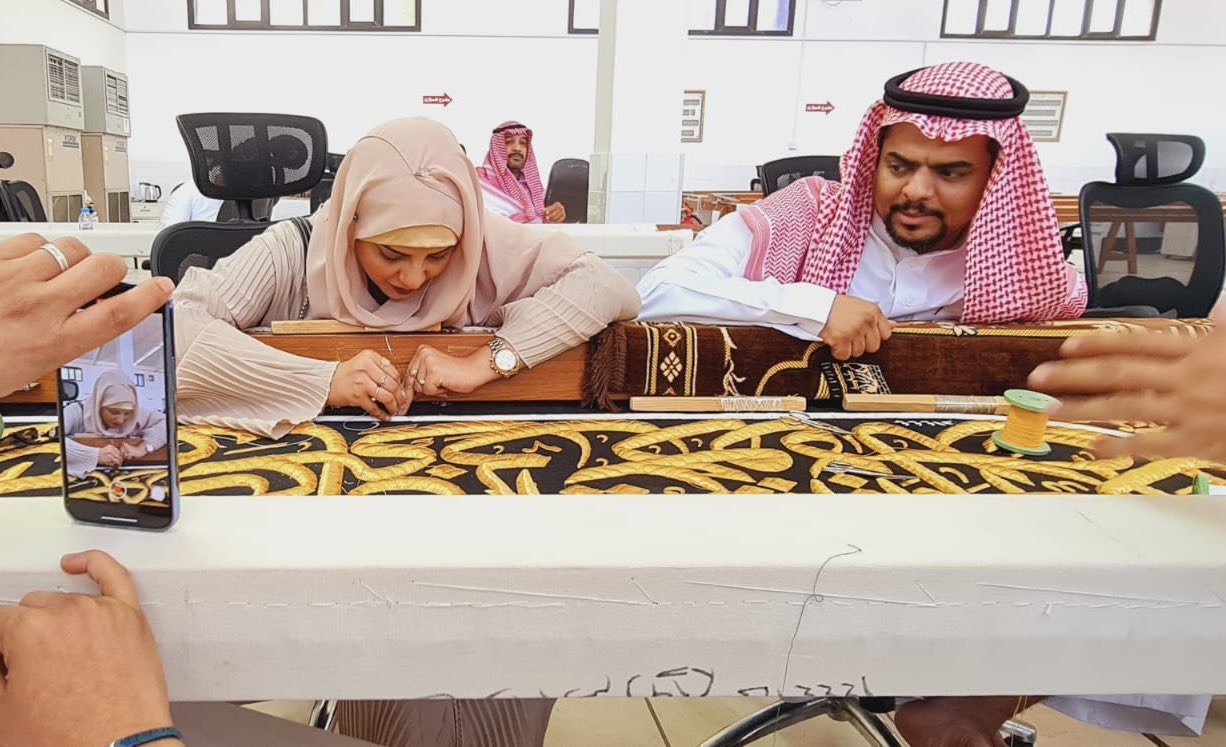 حجاب اڑھے، توجہ غلاف کی طرف مبذول کرے اور عاجزی کے ساتھ کرن کو غلاف کعبہ سیتے ہوئے دیکھا جا سکتا ہے۔