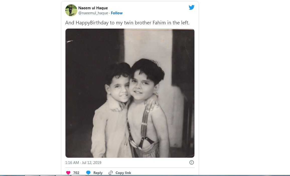 یہ تصویر مشہور سیاستدان نعیم الحق کی ہے۔ 2019 میں نعیم الحق نے ماضی کی یہ تصویر شئیر کی جس میں وہ اور ان کے جڑواں بھائی فہیم موجود ہیں۔
