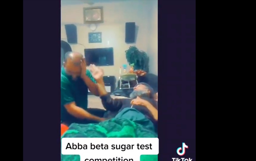 ویڈیو میں دیکھا جا سکتا ہے کہ بیٹا جو کہ شادی شدہ ہے اپنے والد کو جو لیٹے ہوئے ہیں ان ک شوگر چیک کرنے کی کوشش کر رہا ہے۔