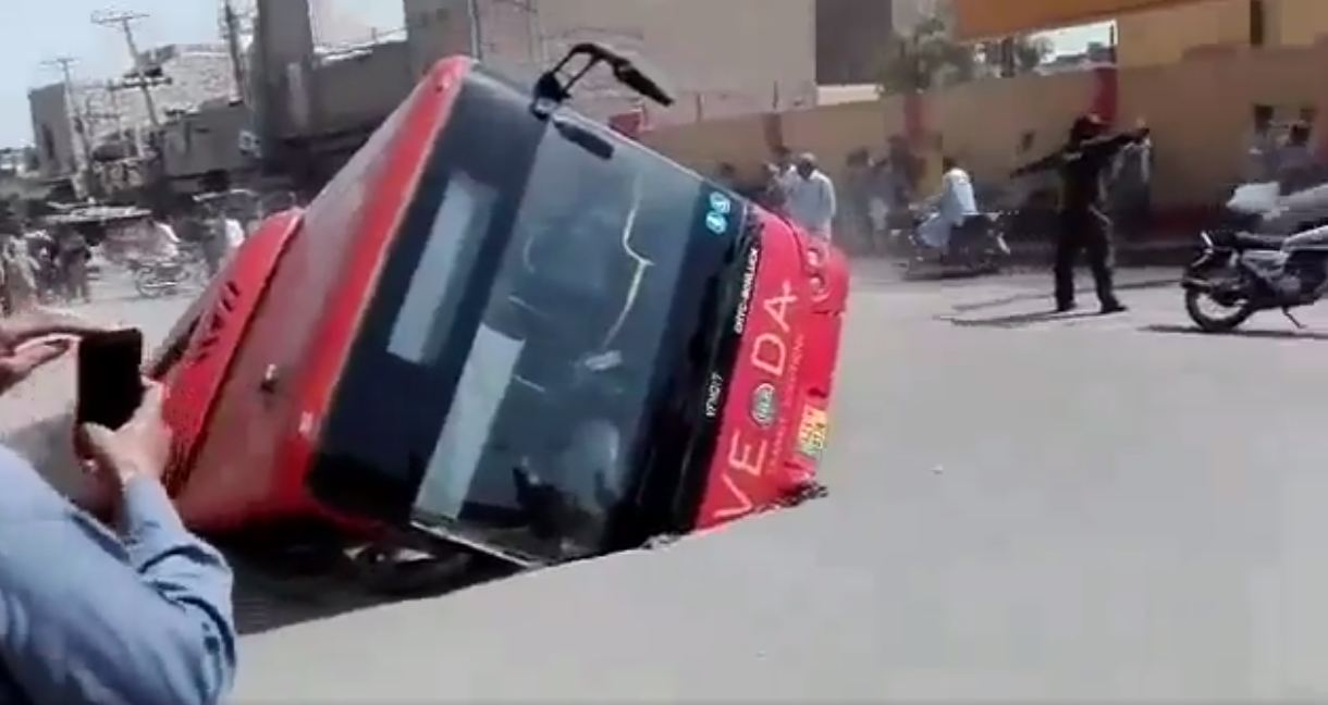 سوشل میڈیا پر ایک صارف کی جانب سے ویڈیو اپلوڈ کی گئی تھی جس میں کہنا تھا کہ لاڑکانہ شہر میں تعمیر شدہ روڈ پر نئی بس سروس کی لال بس گڑھے میں گر گئی ہے۔