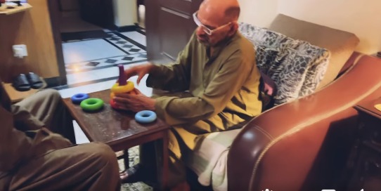 ویڈیو میں دیکھا جا سکتا ہے کہ ایک بزرگ شخص بچوں کے کھلونوں سے کھیل رہے ہیں جبکہ ان کے پاس ایک شخص بھی موجود ہے جو انہیں دیکھ کر مسکرا رہا ہے۔
