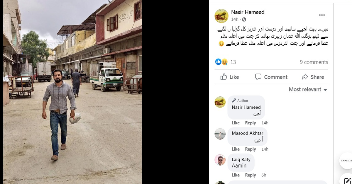 یہ کہنا ہے سوشل میڈیا صارف کا جن کے دوست کا گزشتہ شب کراچی کے علاقے : پی آئی بی کالونی میں گولیاں لگنے سے انتقال ہوگیا ہے۔ خبروں کے مطابق عدنان زبیری کی عمر 35 برس اور ان کے والد کا نام محمد عارف زبیری تھا۔