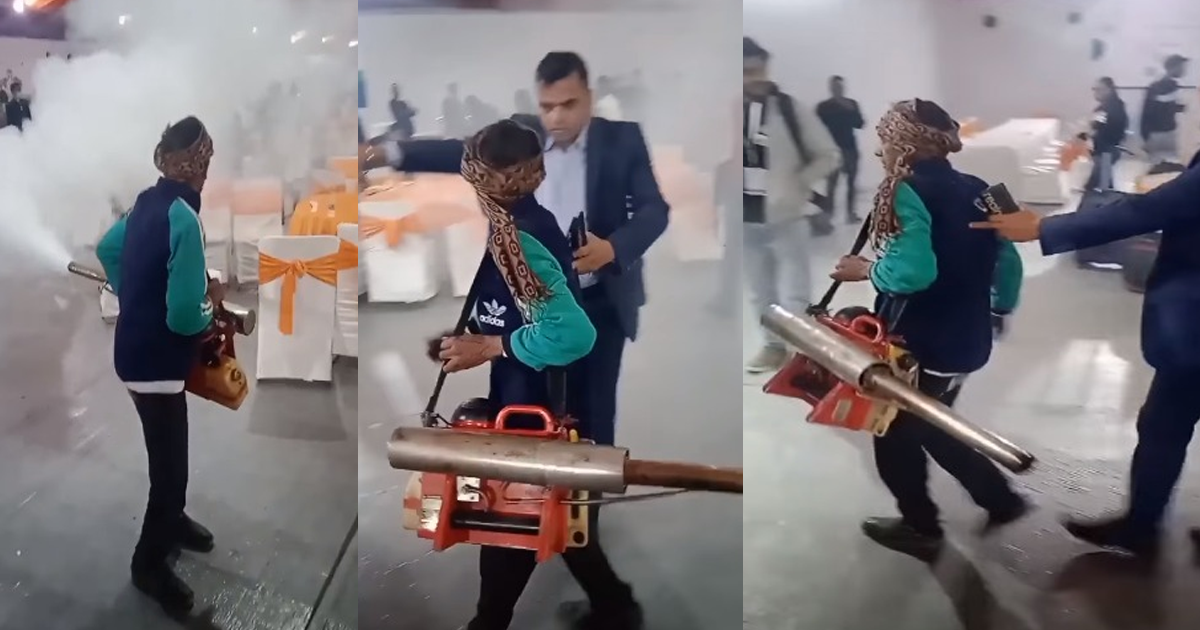 ممکنہ طور پر بھارت کے شادی ہال کی اس ویڈیو میں دیکھا جا سکتا ہے کہ میزبان اس شخص کو ہال سے باہر نکالنے کی بارہاں کوشش کر رہے ہیں تاہم مذکورہ شخص بطور ہتھیار اسپرے کیے جا رہا تھا۔