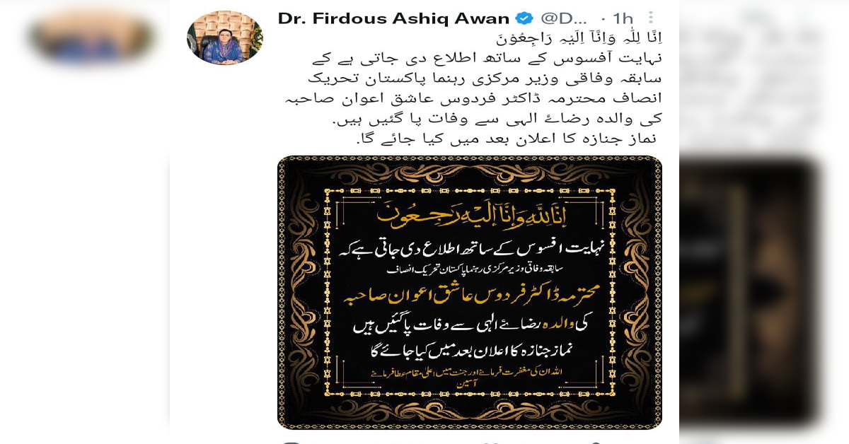فردوس عاشق اعوان کے اکاؤنٹ سے جاری کردہ اعلان کے مطابق ان کی والدہ کے جنازے کا اعلان بعد میں کیا جائے گا جبکہ بڑی تعداد میں لوگ مرحومہ کے لیے دعائے مغفرت کررہے ہیں۔