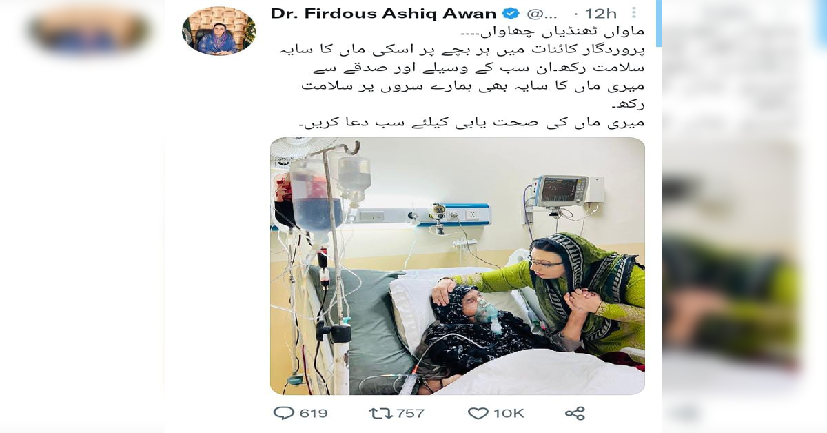 فردوس عاشق اعوان نے گزشتہ دن ٹوئٹر پر اس حوالے سے پوسٹ شئیر کرتے ہوئے لکھا تھا کہ "ماواں ٹھنڈیاں چھاواں پروردگار کائنات میں ہر بچے پر اسکی ماں کا سایہ سلامت رکھ۔ان سب کے وسیلے اور صدقے سے میری ماں کا سایہ بھی ہمارے سروں پر سلامت رکھ میری ماں کی صحت یابی کیلئے سب دعا کریں۔"