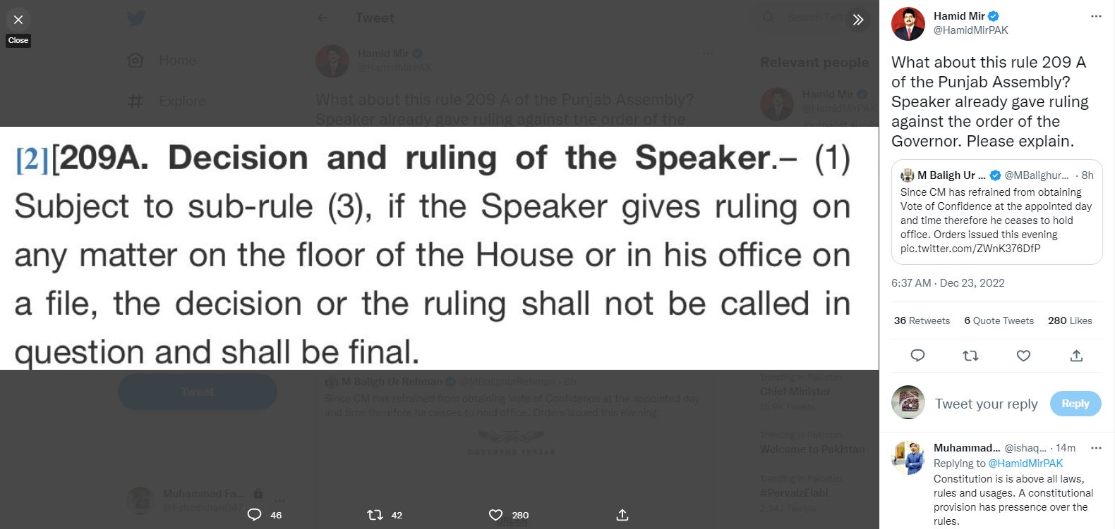 ساتھ ہی صحافی نے آرٹیکل 209 اے کی تصویر بھی شئیر کی، جو کہتا ہے کہ اگر اسپیکر ہاؤس کے فلور پر کوئی بھی رولنگ دے، تو اس پر سوال نہیں اٹھایا جا سکتا ہے اور اسے حتمی سمجھا جائے گا۔