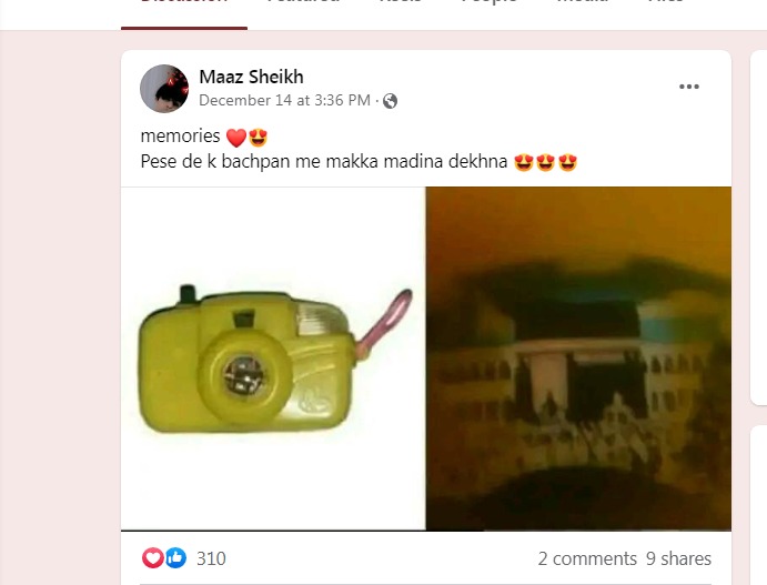 اس تصویر میں پلاسٹک کا کیمرہ اگرچہ بچوں کے لیے کھلونے کی حیثیت رکھتا ہے مگر بچپن میں پہلی بار اسی کیمرے کی مدد سے ہماری آنکھ سے خانہ کعبہ اور روضہ رسول صلی اللّٰہ علیہ وسلم کی زیارت کی تھی۔ جس کے بعد اس منظر کو براہِ راست دیکھنے کی طلب جاگی۔