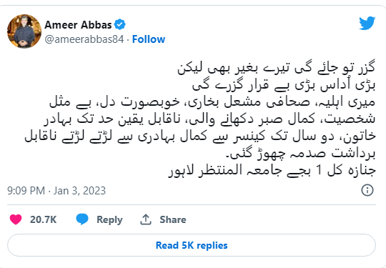 مشعال بخاری کے شوہر اینکر پرسن امیر عباس نے ٹوئٹر پر پوسٹ شئیر کرتے ہوئے لکھا کہ میری اہلیہ، صحافی مشعل بخاری، خوبصورت دل، بے مثل شخصیت، کمال صبر دکھانے والی، ناقابل یقین حد تک بہادر خاتون، دو سال تک کینسر سے کمال بہادری سے لڑتے لڑتے ناقابل برداشت صدمہ چھوڑ گئی۔