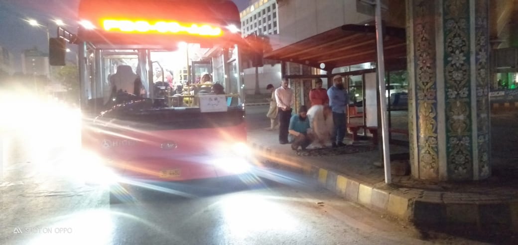 گلشن حدید سے ٹاور کے روٹ پر چلنے والی مسافر بس کے ڈرائیور نے اچانک ڈھلتے سورج کو دیکھ کر اور اذان کی آواز کو سن کر شارع فیصل پر جناح اسپتال کے مقام پر بس اچانک روک دی۔