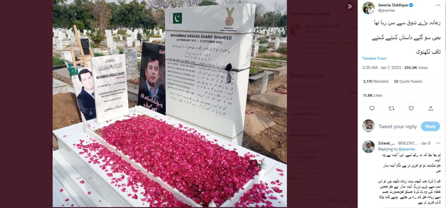 ارشد شریف کی قبر کو پکا کر دیا تھا، جس کے بعد اہلیہ نے ثاقب لکھنوی کا شعر شئیر کیا،