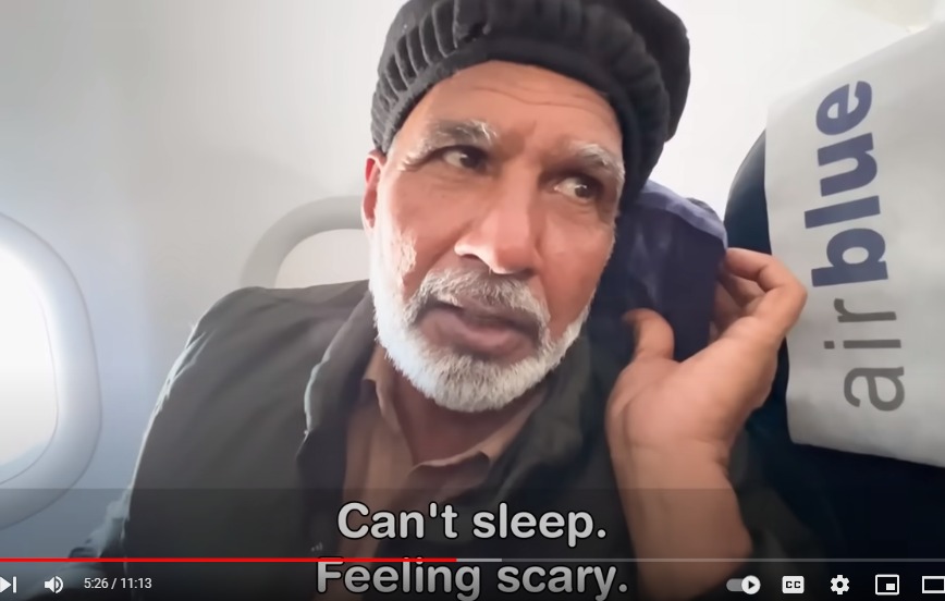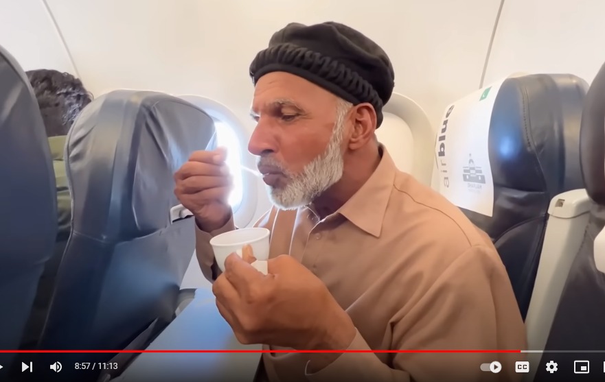 تو ایک بوڑھے نے فورا کہا کہ ائیرپورٹ پر ہی پیٹ پوجا کر لیتے ہیں، تاکہ جہاز میں نہ کھا سکیں، کیونکہ اس دوران الٹیاں ہو سکتی ہیں۔ ایک موقع پر بوڑھے شخص نے یہ تک کہہ دیا کہ ہم پروں پر بیٹھے ہیں کیا؟ دراصل وہ جہاز کے بڑے پروں کو دیکھ کر حیران تھے۔