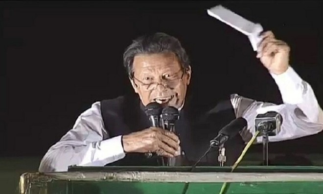 عمران خان نے اس جلسے میں ایک کاغذ لہراتے ہوئے کہا تھا کہ ’ہمارے پاس جو ثبوت ہیں، ہر چیز کو میں ظاہر کر رہا ہوں۔ میرے پاس ایک خط ہے جو ثبوت ہے۔ ہمیں دھمکی دی گئی ہے لیکن ہم قومی مفاد پر سمجھوتہ نہیں کریں گے۔‘