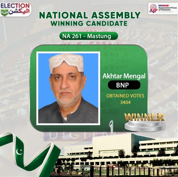 اسلام آباد۔9فروری (اے پی پی):قومی اسمبلی کے حلقہ این اے-261 سوراب/قلات/مستونگ سے بلوچستان نیشنل پارٹی کے امیدوار محمد اختر مینگل 3 ہزار 404 ووٹ لے کر کامیاب قرار پائے۔