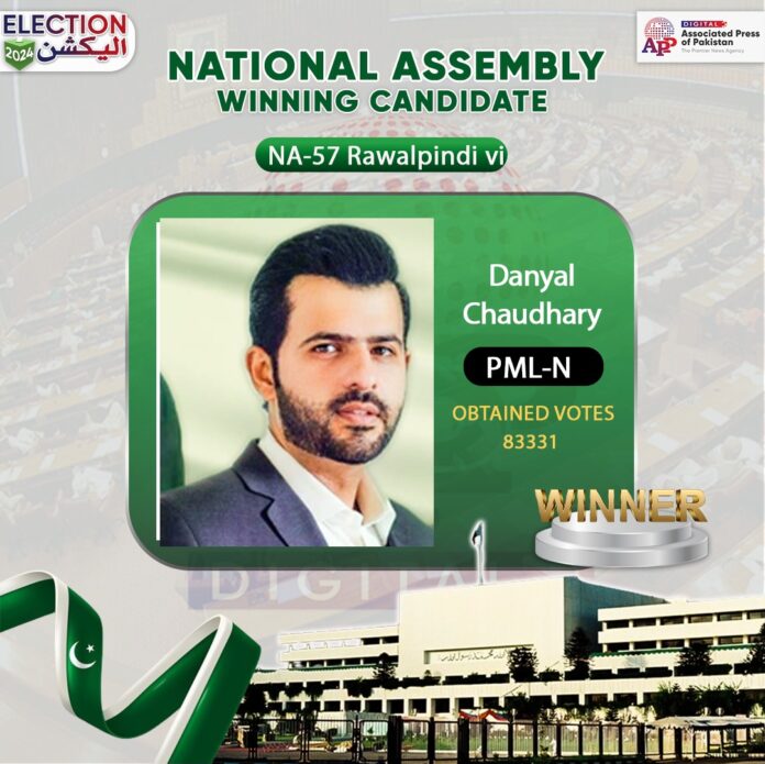 اسلام آباد۔9فروری (اے پی پی):قومی اسمبلی کے حلقہ این اے 57 راولپنڈی 6 سے پاکستان مسلم لیگ ن کے امیدوار دانیا ل چوہدری 83 ہزار 331 ووٹ لے کر کامیاب قرار پائے ۔