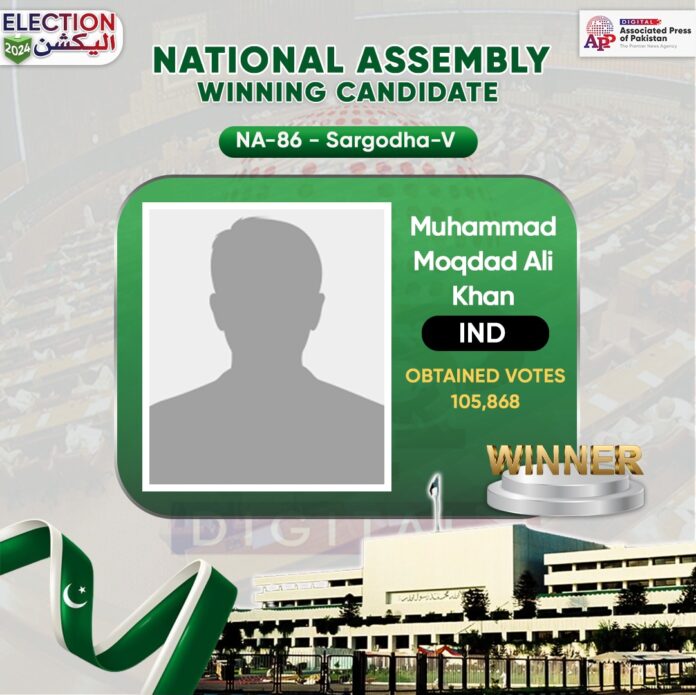 اسلام آباد۔9فروری (اے پی پی):قومی اسمبلی کے حلقہ این اے 86سرگودھا Vسے آزاد امیدوار محمد مقداد علی خان ایک لاکھ 5ہزار 868ووٹ لے کرکامیاب قرار پائے ۔