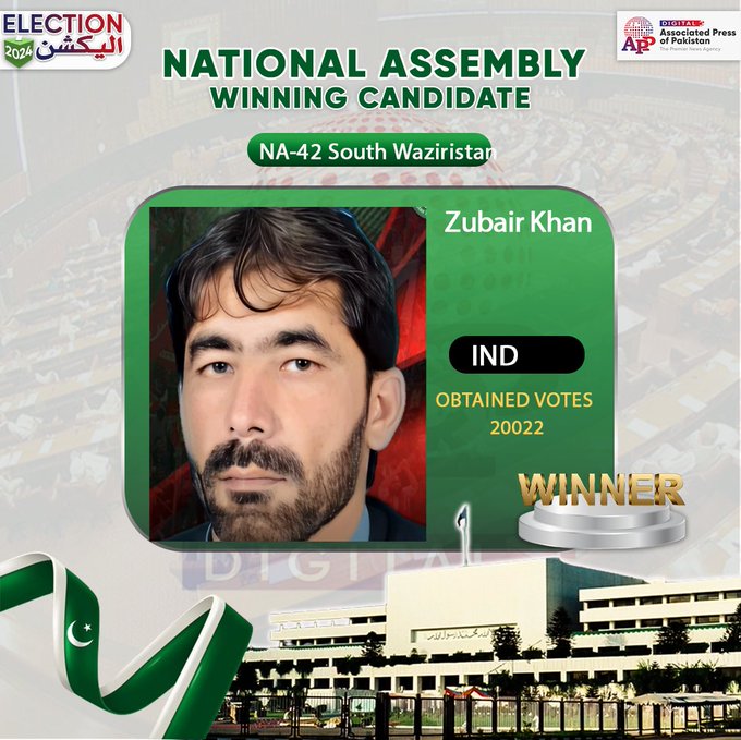 اسلام آباد۔9فروری (اے پی پی):قومی اسمبلی کے حلقہ این اے 42جنوبی وزیرستان /اپر/کم جنوبی وزیرستان لوئرسے آزاد امیدوار زبیر خان20ہزار 22ووٹ لے کرکامیاب قرار پائے ۔