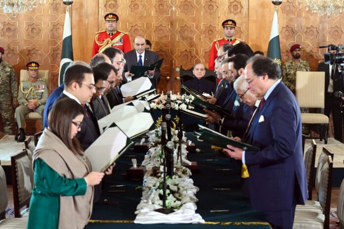 اسلام آباد۔11مارچ (اے پی پی):19 رکنی نئی وفاقی کابینہ نے حلف اٹھا لیا۔ حلف برداری کی تقریب پیر کو یہاں ایوان صدر میں منعقد ہوئی۔ صدر مملکت آصف علی زرداری نے نئی وفاقی کابینہ کے ارکان سے ایک سادہ اور پروقار تقریب میں حلف لیا۔ وفاقی کابینہ کی حلف برداری کی تقریب میں وزیراعظم محمد شہباز شریف، مسلح افواج کے اعلیٰ افسران سمیت اسلام آباد میں متعین غیر ملکی سفارتکاروں، اراکین اسمبلی اور دیگر اہم شخصیات نے شرکت کی۔