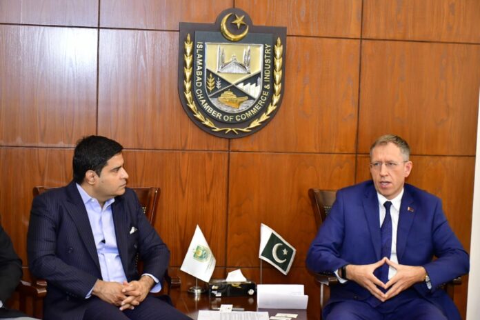 انہوں نے کہا کہ چیمبر ہا ئوسزمختلف ممالک کے درمیان تجارتی تعلقات کو فروغ دینے میں ہمیشہ اہم کردار ادا کرتے ہیں، ان کا سفارتخانہ چیمبر کے ساتھ مل کر بیلاروسی اور پاکستانی بزنس کمیونٹی کے ساتھ تعاون کے لئے تیار ہے۔ اس موقع پر احسن ظفر بختاوری نے کہا کہ بیلاروس مشرقی یورپ کا ایک اہم ملک ہے جس کے ساتھ پاکستان کا آزادانہ تجارتی معاہدہ ناگزیر ہے،دونوں ممالک کے در میان تجارت اور تعاون کے نئے امکانات کا جائزہ لینے کی ضرورت ہے۔انہوں نے کہا کہ اسلام آباد چیمبر آف کے وفد کی بیلاروس جانے کی منصوبہ بندی کر رہے ہیں جس سے دونوں ممالک کی بزنس کمیونٹی کو براہ راست روابط پیدا کرنے اور تجارتی تعلقات کو فروغ دینے کیلئے مل کر کام کرنے کا موقع ملے گا۔چیئرمین فائونڈر گروپ خالد اقبال ملک نے پاکستان اور بیلاروس کے درمیان اقتصادی تعلقات کے حوالے سے گفتگو کرتے ہوئے کہا کہ دونوں ممالک کے نجی شعبے باہمی تعاون کو فروغ دیں ۔ تجارتی تعلقات کو مضبوط بنانے کے لئے نجی شعبے کو آگے آنا ہوگا۔ظفر بختاوری نے کہا کہ پاکستان اور بیلاروس کے دوطرفہ تعلقات باہمی احترام اور اعتماد اور تعمیری مکالمے پر مبنی ہیں جس کی بنیاد دوستی اور تعاون پر مبنی ہے۔ یہ تعلقات مسلسل اعلی سطحی تبادلوں اور اقتصادی، صنعتی اور زرعی شعبوں میں مضبوط تعاون کے ساتھ آگے بڑھ رہے ہیں ۔،بیلا روس اور پاکستان وسائل کی دولت سے مالامال ہیں اس لیے دونوں مل ملکر کام کریں تو ترقی کی نئی راہیں کھل سکتی ہیں۔ ملاقات میں بیلاروس چیمبر آف کامرس اینڈ انڈسٹری کے نمائندے جورابیک کرگیز بیکوف ممبران آئی سی سی آئی شیخ محمد اعجاز، مقصود تابش، اختر حسین بھی موجود تھے۔