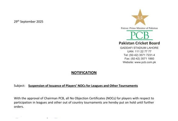 پی سی بی کے چیف آپریٹنگ آفیسر سمیر احمد کی جانب سے باضابطہ نوٹیفکیشن جاری کیا گیا ہے جس میں کہا گیا ہے کہ کھلاڑیوں کو جاری کردہ غیر ملکی لیگز اور بیرونِ ملک ٹورنامنٹس کے تمام این او سی فی الحال ہولڈ پر رکھے جاتے ہیں۔