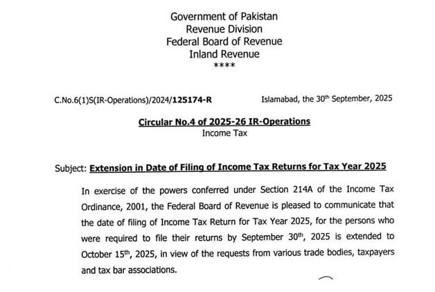 فیڈرل بورڈ آف ریونیو نے ٹیکس دہندگان کو ریلیف دیتے ہوئے انکم ٹیکس گوشوارے جمع کرانے کی آخری تاریخ میں 15 روز کی توسیع کر دی ہے۔ اب مالی سال 2025 کے گوشوارے جمع کرانے کی نئی آخری تاریخ 15 اکتوبر 2025 مقرر کر دی گئی ہے۔