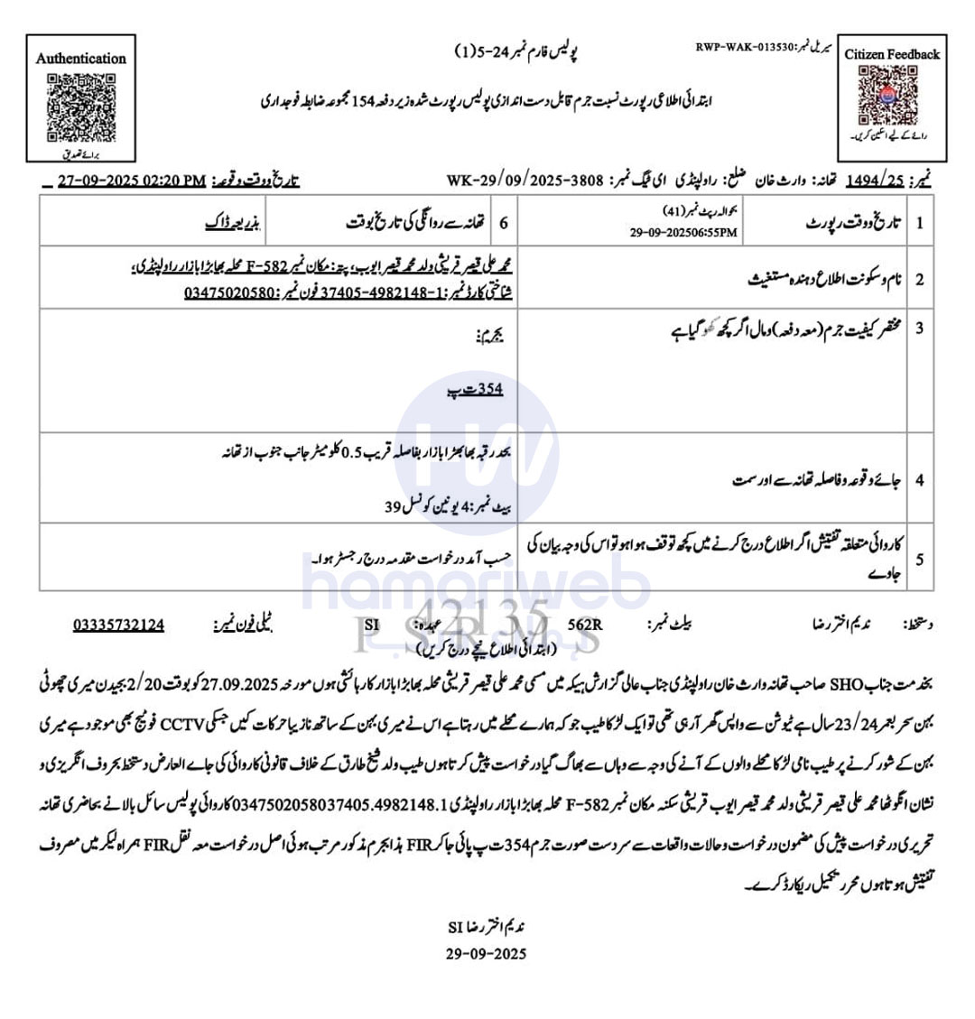 ترجمان CCD کے مطابق ملزم نے ٹیوشن سے گھر واپس آنے والی لڑکی کے ساتھ نازیبا حرکت کرتے ہوئے ہراساں کیا تھا، جس کی سی سی ٹی وی فوٹیج بھی منظر عام پر آئی تھی۔ واقعے کا مقدمہ تھانہ وارث خان میں درج کیا گیا تھا۔