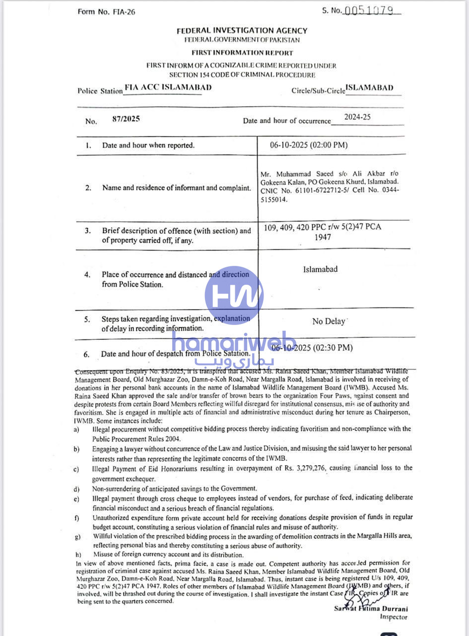 وائلڈ لائف کے تحفظ کے منصوبوں میں مبینہ بدعنوانی کے الزامات میں ملوث رینا سعید کو ایف آئی اے نے بالآخر قانون کے دائرے میں لے لیا ہے۔ذرائع کے مطابق ایف آئی اے کی طویل انکوائری کے بعد رینا سعید کے خلاف باقاعدہ ایف آئی آر درج کر لی گئی ہے جس میں کروڑوں روپے کی مبینہ خوردبرد اور اختیارات کے ناجائز استعمال کے الزامات شامل ہیں۔