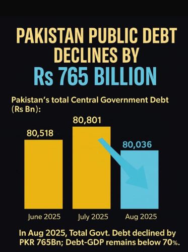 پاکستان کی معیشت میں استحکام کے اشارے نمایاں ہونے لگے۔ وزارتِ خزانہ کے مطابق اگست 2025 تک مرکزی حکومت کے مجموعی قرض میں 765 ارب روپے کی نمایاں کمی ریکارڈ کی گئی ہے جو مالی نظم و ضبط کی پالیسیوں کا نتیجہ قرار دی جا رہی ہے۔