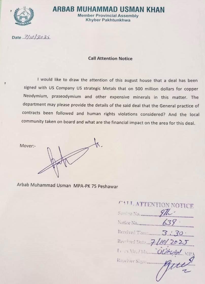 عوامی نیشنل پارٹی کے رکنِ صوبائی اسمبلی ارباب عثمان خان نے خیبر پختونخوا اسمبلی میں ایک توجہ دلاؤ نوٹس جمع کرایا ہے، جس میں صوبائی حکومت سے مطالبہ کیا گیا ہے کہ امریکی کمپنی کے ساتھ 500 ملین ڈالر مالیت کے معاہدے کی تمام تفصیلات ایوان میں پیش کی جائیں۔