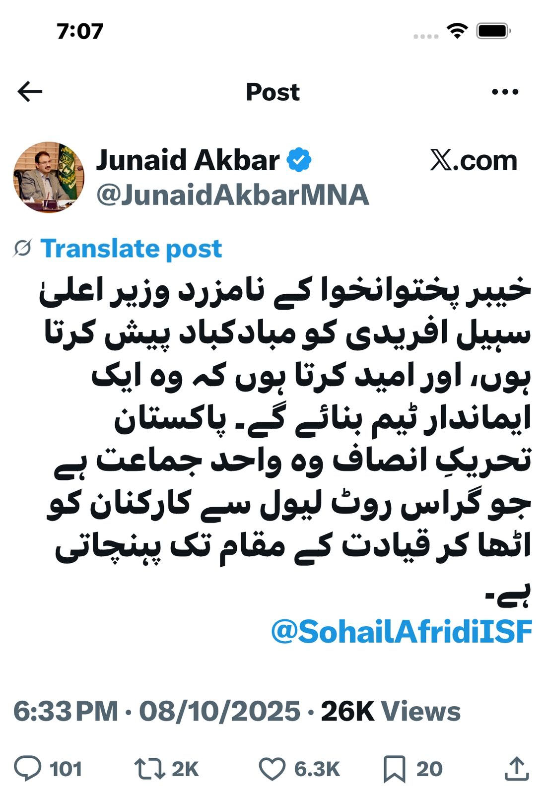 پی ٹی آئی کے صوبائی صدر جنید اکبر نے بانی پی ٹی آئی عمران خان کی جانب سے خیبر پختونخوا کے لیے نامزد وزیرِ اعلیٰ سہیل آفریدی کو مبارک باد پیش کرتے ہوئے کہا کہ امید ہے کہ سہیل آفریدی ایک ایماندار ٹیم بنائیں گے۔