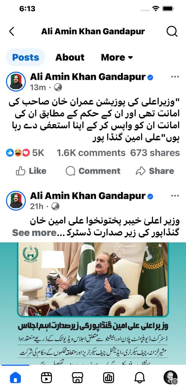 فیس بُک اکاؤنٹ پر علی امین گنڈاپور نے کہا کہ وزارتِ اعلیٰ کی پوزیشن عمران خان کی امانت تھی اور ان کے حکم کے مطابق ان کی امانت کو واپس کرکے اپنا استعفیٰ دے رہا ہوں۔