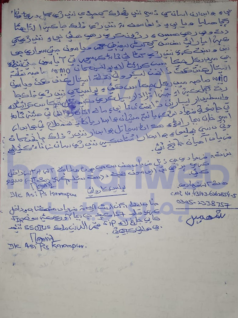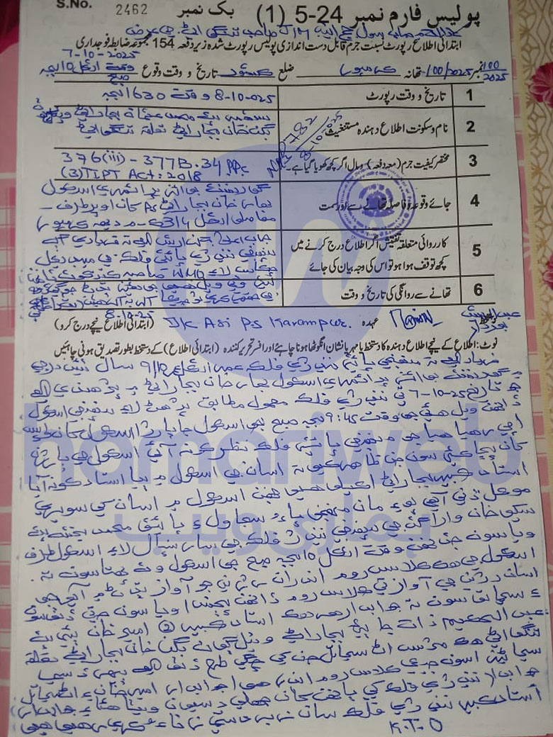 گاؤں باگن خان بجارانی کے بہار خان پرائمری اسکول میں پڑھنے والی طالبہ کے چاچا شہمیر بجارانی کی شکایت پر کرم پور پولیس اسٹیشن میں کبیر بجارانی، اس کے بھائی اور ایک ساتھی سمیت تین افراد کے خلاف مقدمہ درج کیا گیا ہے۔